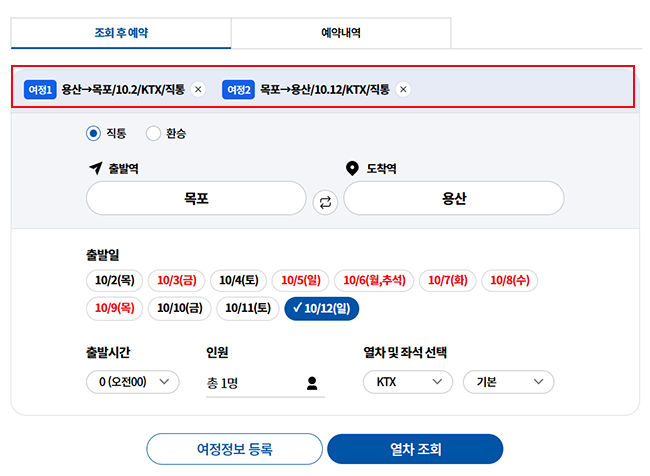 '여정1' 또는 '여정2' 등 사전에 저장된 여정을 불러와 예약을 편리하게 하실 수 있습니다.